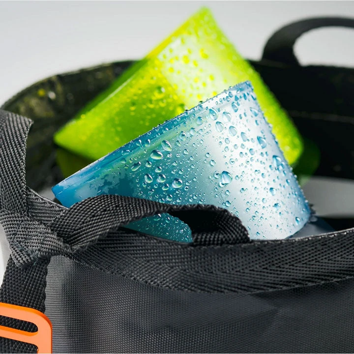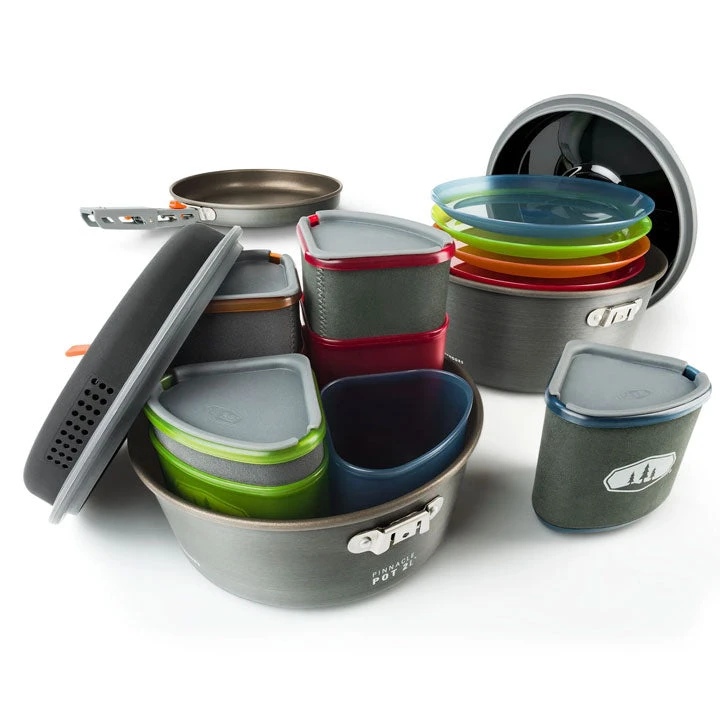 So efficient, so durable, so technically advanced, so colorful – this is the Pinnacle of campsite cooking. And eating, too. Garnet hard, the anodized aluminum pots and frypan are scratch proof and deliver efficient, even heating. Then we add Teflon® with Radiance Technology for amazing non-stick performance, easy cleaning, and amazing heat transfer that reaches temperature 25% faster than other coatings. When it’s time to eat, you’ve got four 14oz mugs with insulated sleeves and sip through lids, four 14oz bowls, and four plates – all color coded so there’s no mix ups. There’s also a pot gripper and our strainer lid for easy draining. And – of course – it all nests together perfectly into the storage bag that doubles as a camp sink.